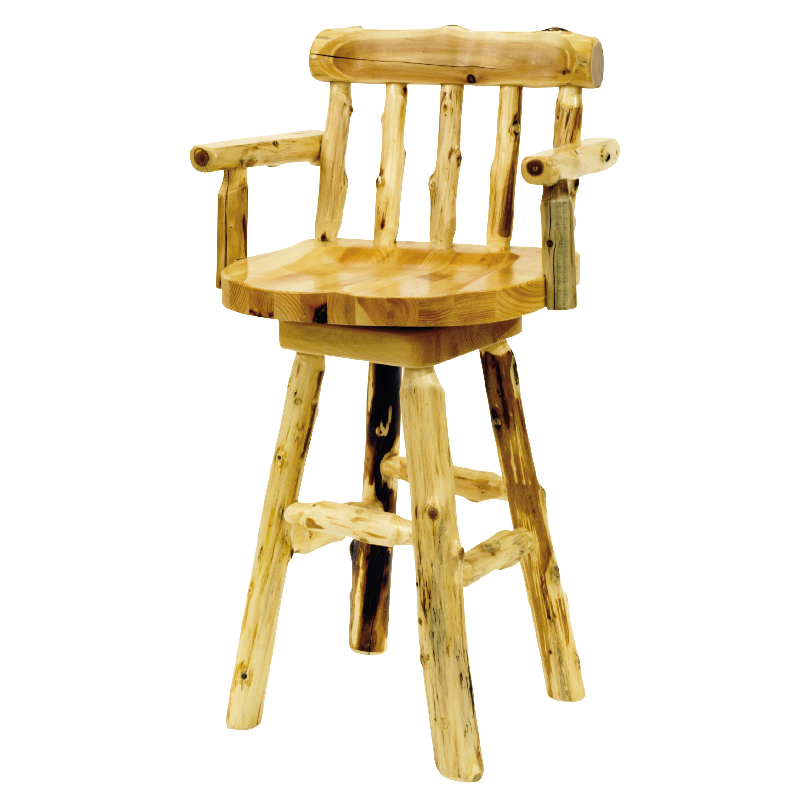 These white cedar log bar stools with back and arms are available in either 24″ counter height or 30″ bar height, with swiveled and contoured seats. Optional wood burning of wildlife on the backrest is available.