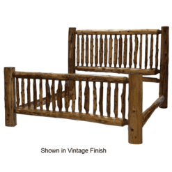 Each of these log spindle beds is individually handcrafted, making it one-of-a-kind, heirloom-quality rustic log furniture. The name comes from the finely crafted spindles which are featured in both the headboard and footboard.