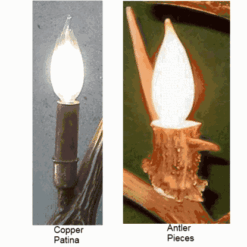 Pictured without optional rawhide shades, the candles are made from natural antler pieces and all electrical wiring in this antler lighting is skillfully hidden within the antlers. Antlers are securely screwed together, then patched to hides screws and colored to match. All parts are UL listed. All necessary mounting hardware is included. All of our antler lighting is made from naturally shed antlers collected from the wild – no animals are ever harmed.