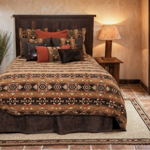 Transform your bedroom into a desert-inspired retreat with the Hitchin’ Post Desert ensemble. Featuring warm hues of browns, rust, and golds, this collection captures the beauty of the desert landscape while adding pops of Western flair with luxurious faux leather accents. Crafted from 100% polyester, the ensemble ensures durability and comfort. The duvet reverses to rich Chocolate Suede for added versatility.