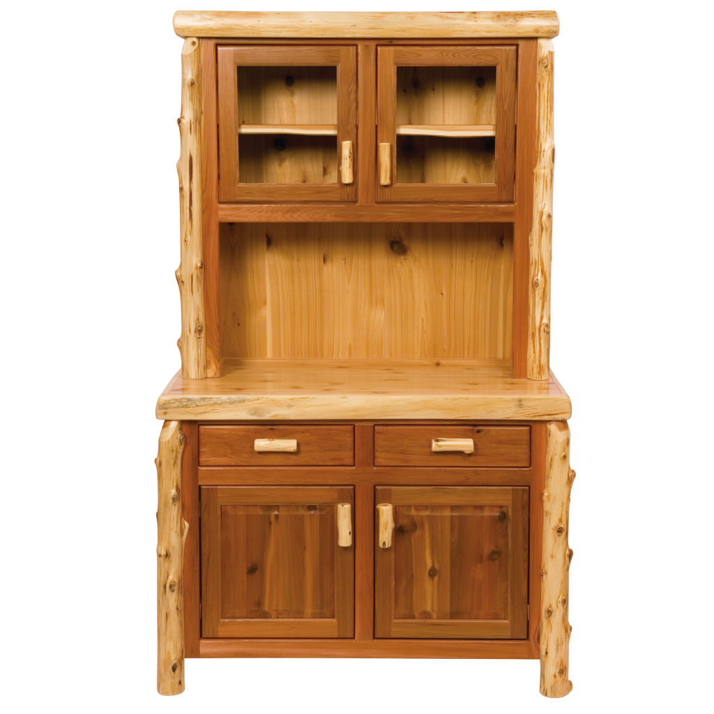 Available with optional hutch, this cedar log buffet is a fit for any rustic dining motif. There is an adjustable shelf behind each of the doors in the buffet. The optional hutch includes glass doors and the buffet includes 2 drawers and 2 doors.