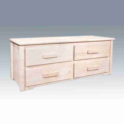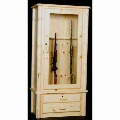 The Northwoods Log Gun Cabinet is handcrafted from knotty pine and can safely accommodate up to 8 guns. The upper cabinet and two lower drawers feature secure locks. All hinges are hidden and drawers feature 100 lb gliders. Logs are “draw knifed” for the distinctive rustic look. The solid construction of this piece of rustic log furniture is back by a manufacturer’s lifetime warranty of workmanship and materials.