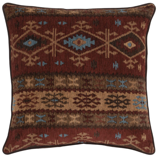 Made with Mountain Sierra II fabric with geometrical patterns in rich deep tones of red, tans and browns with a touch of turquiose. Back and welted with Espresso Fabric. Perfect for any rustic log furniture themed bedroom.