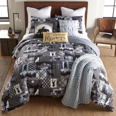 Take a stroll through the moonlight with this beautiful comforter set from Donna Sharp. Nightly Walk is a reversible 3-piece, stunning lodge themed set with a modern grid design. This beautiful bedding set depicts the moonlit silhouettes of creatures and landscapes found in nature using black, taupe, sky blue, vanilla, and slate colors. Accessories sold separately.