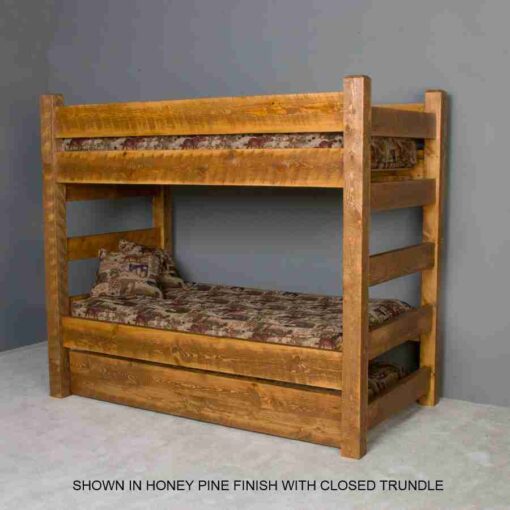 If in need for extra storage or sleeping, this bunk bed offers the option of drawers underneath or a roll out trundle (standard Twin size). See “Additional Images” thumbnails above for photo of bunk bed with Honey Pine finish and with optional trundle and under bed drawers.