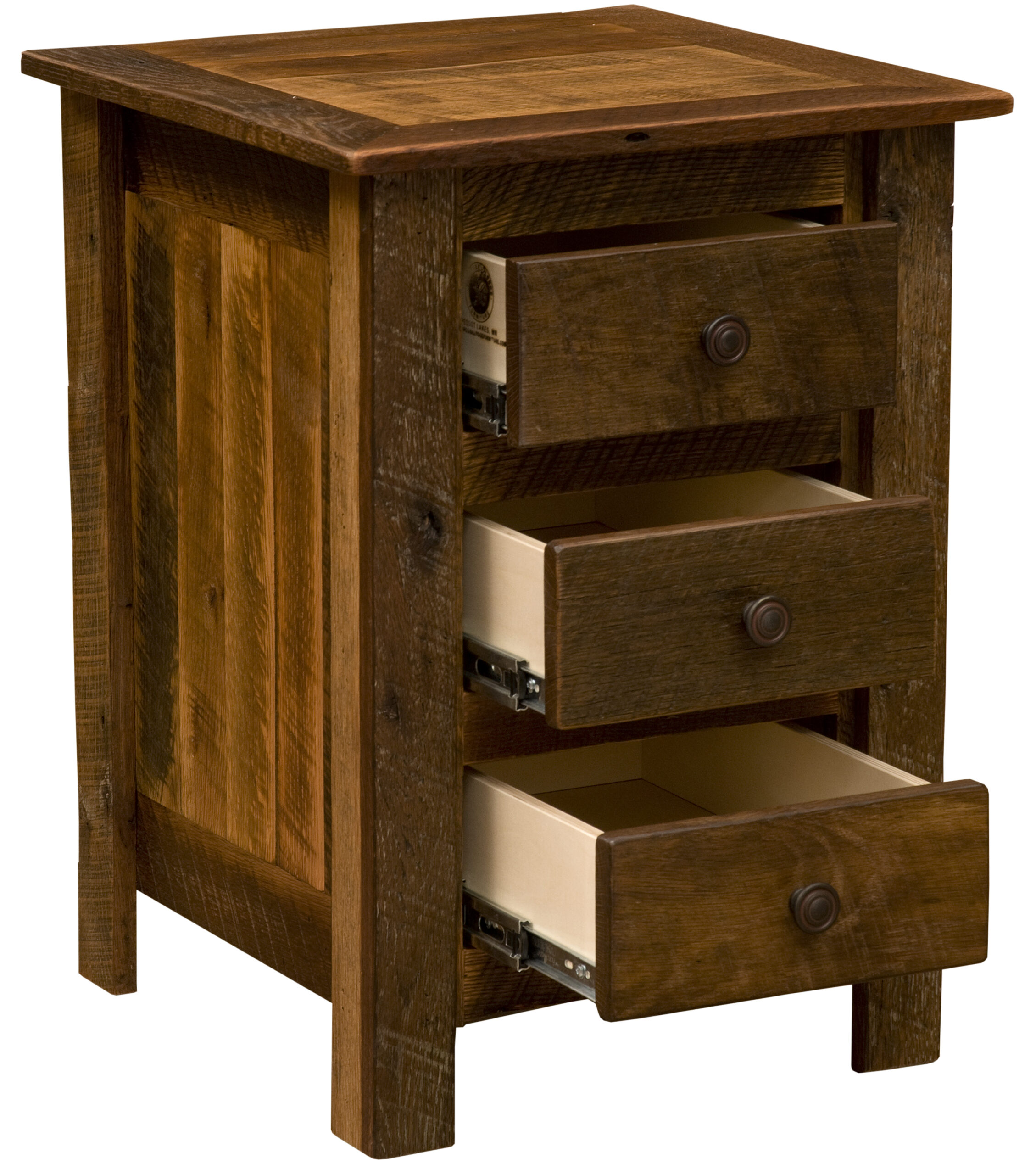 Features of this 3 drawer reclaimed wood nightstand include: