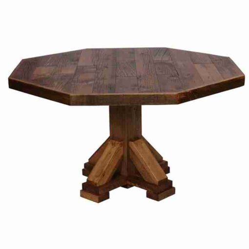 Supporting comfortable room for eight, this stunning reclaimed wood octagon dining table will make a bold rustic statement in your dining area, but it makes for a great card or game table as well. This authentic reclaimed wood table is handmade from weather-aged wood recovered from old barns and other structures in the Rocky Mountain area. Some furniture pieces include support parts made from natural dead-standing timbers.