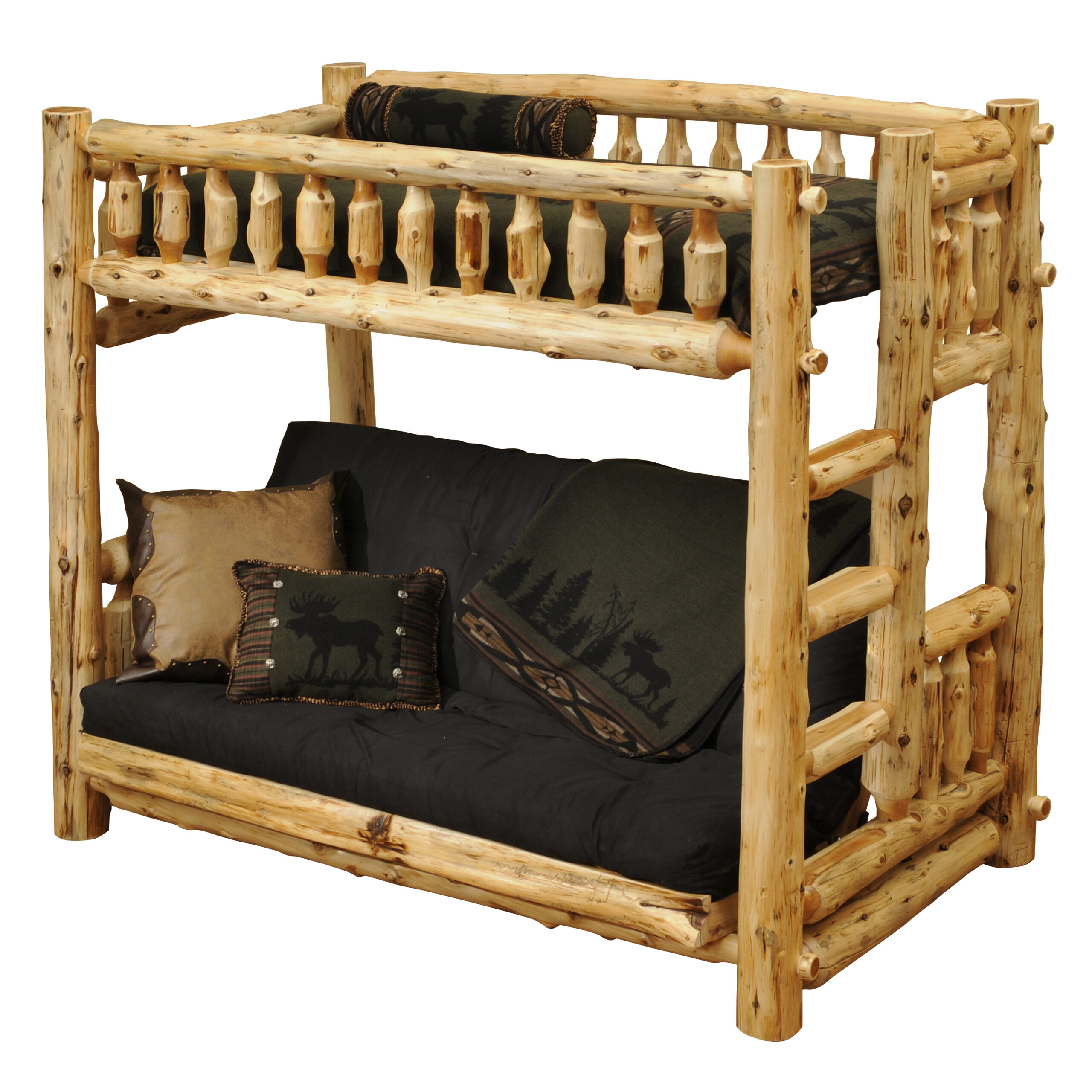 This twin-over-futon log bunk bed features:
