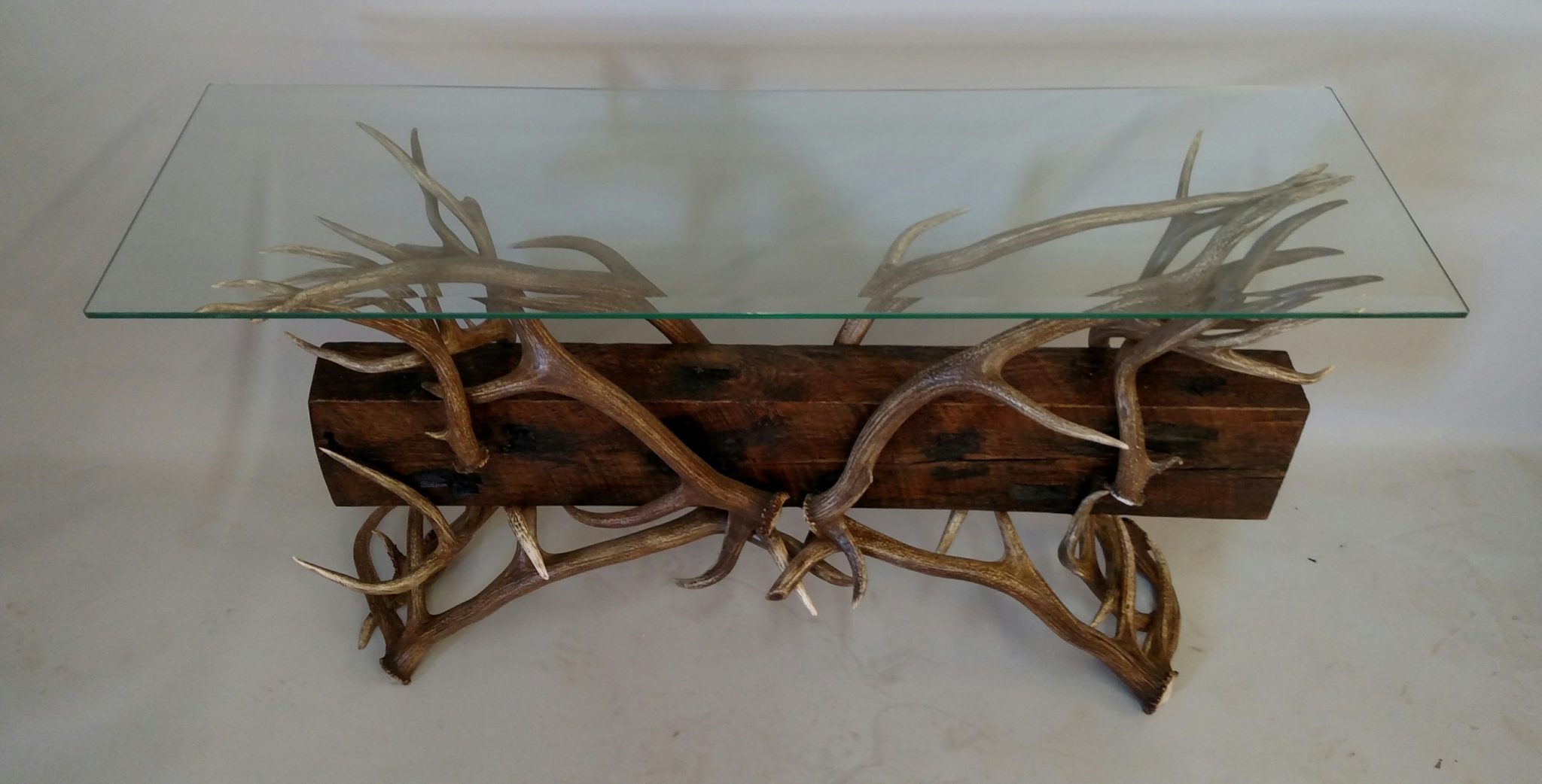 This table stands approximately 30″ tall and comes with a 1/2″ beveled-glass tabletop that is 52″L x 16″ wide. None of the antler points are cut or shaved, thus displaying the beauty and elegance of nature in its purest form.