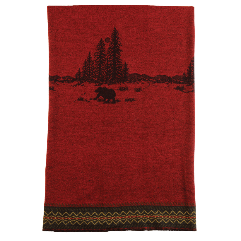 This cozy “Wooded River Bear” premium throw blanket will make a warm and inviting complement to your mountain cottage or log cabin bedroom. The warm red background features repeating silhouettes of grizzly bear wondering through pine trees, accented with a rustic green, tan and red pattern trim.